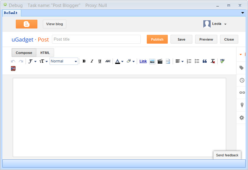 Try with 1.0.2.0, this version pass the blogger home but stuck at post page (screenshot) before close without posting.