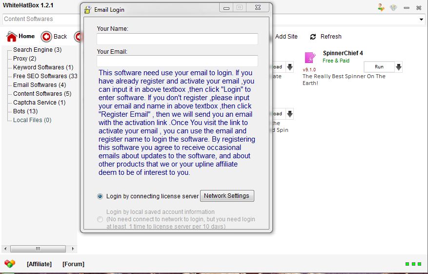 I have a problem after setting up Spinner Chief 4. When I open the Spinner Chief, it doesn't have either Register Email or Log In Button. Please see attached picture that I have captured.