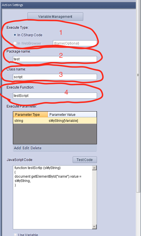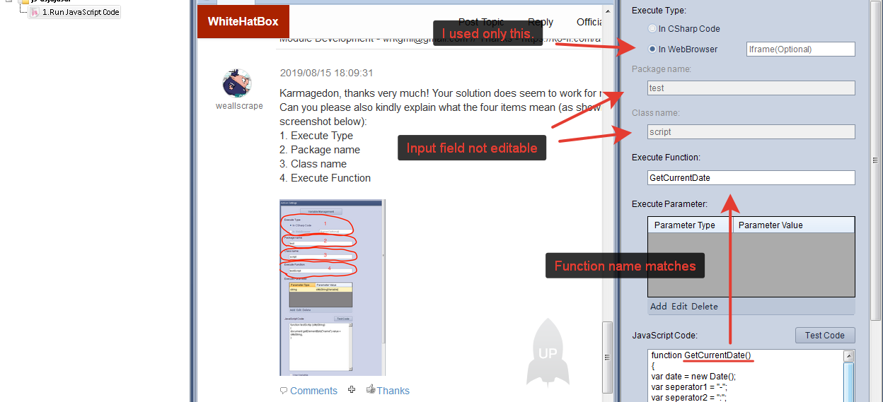 Execute Function - this is the name of the function in your code that needs to be called. It is necessary to indicate it so that the editor understands what exactly he should do. You just need to specify the same name in this field as in the code in Java script.