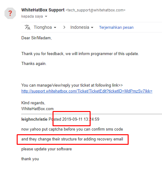 have you tried your own software to add recovery email? since yahoo has updated their structure. i also already open ticket, and still you dont update your software for recovery email.