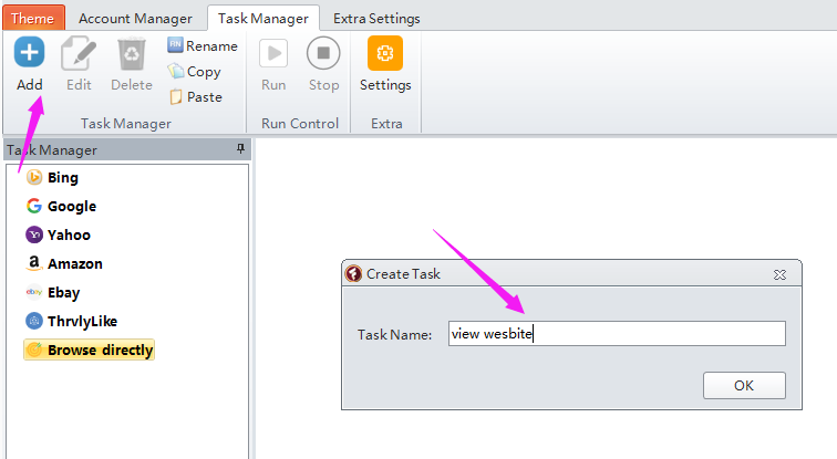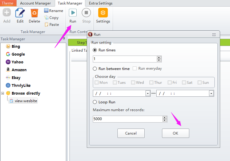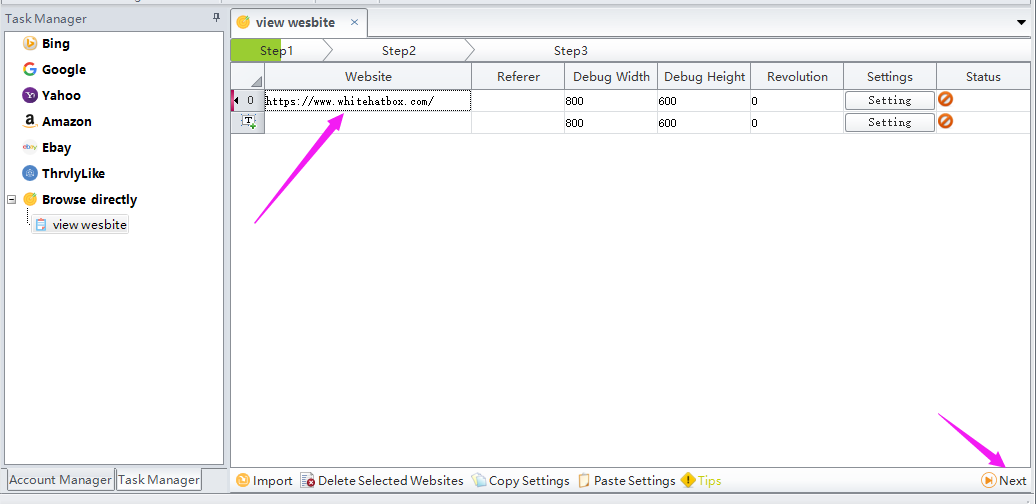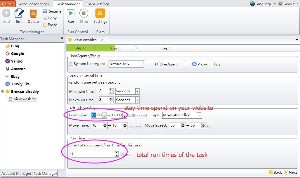 Create a task under "Browse directly" tab, then enter your website link in "Website" filed, then click Next button to setup settings for the next page. You can setup a stay time spend on your page in "Load Time" filed, the unit is millisecond. And you can setup a run times in "Enter total number of run times for this task" filed. After the settings are done for this page, just click “Next ” button to view the next settings page. After all are done, then you can click Start button to run it.