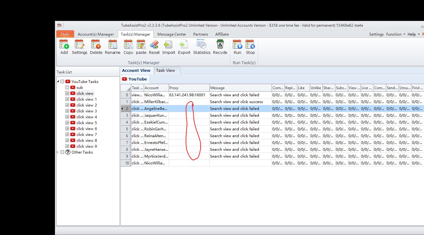 i clicked on recommend setting on tube pro 2 to settup "find kw, click and views". Ater that, last step, view task is not running.