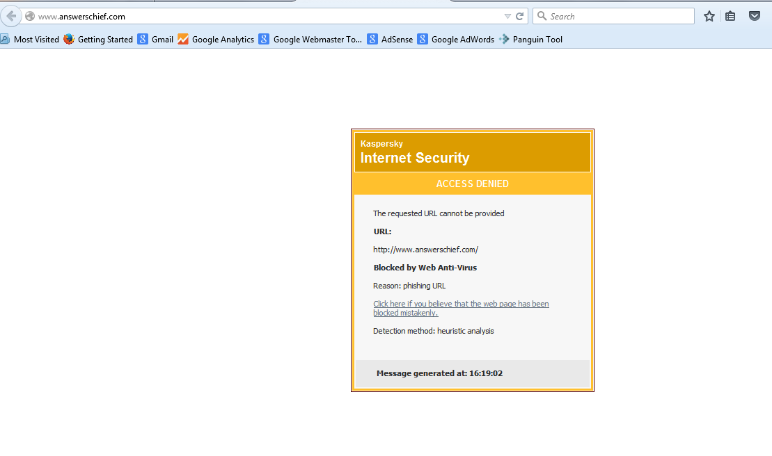 Hi, shashankscg. The reason why you got this issue is that users installed BullGuard Internet Security which cannot trust this site www.answerschief.com. So it stop to open this site www.answerschief.com. I hope my clarification has been helpful.