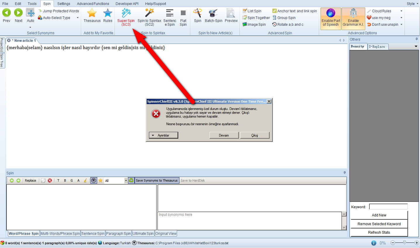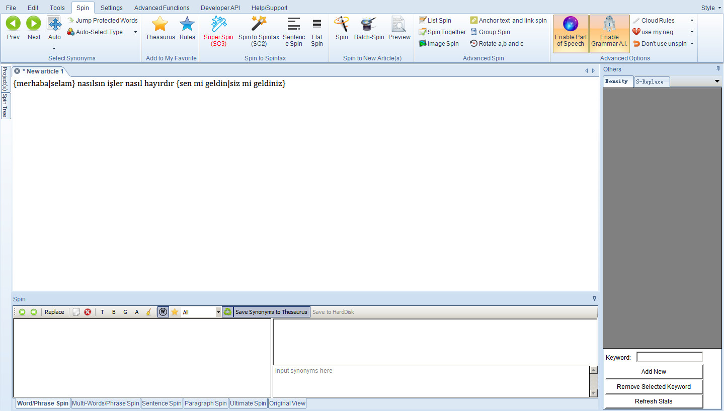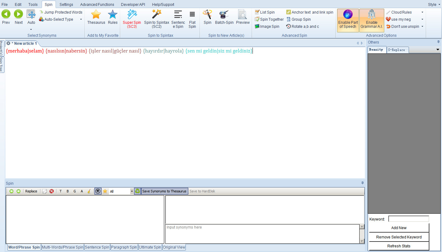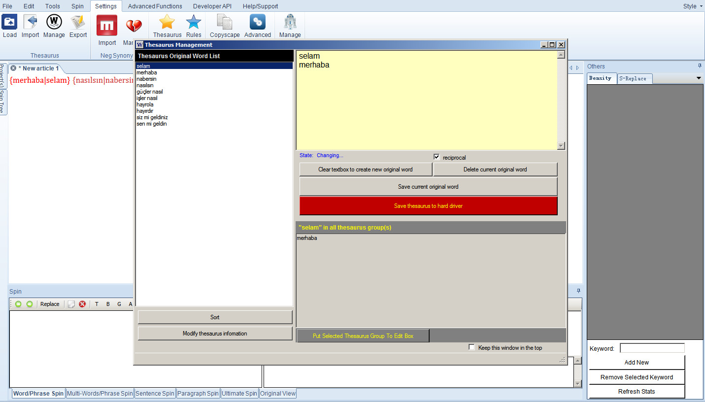 Hello, I'm creating a new language (thesaurus). However, when I do spin the words doesn't change. I am create new thesaurus. And save. But click on Spin to Spintax and few words change. If i click Super Spin, program is crash