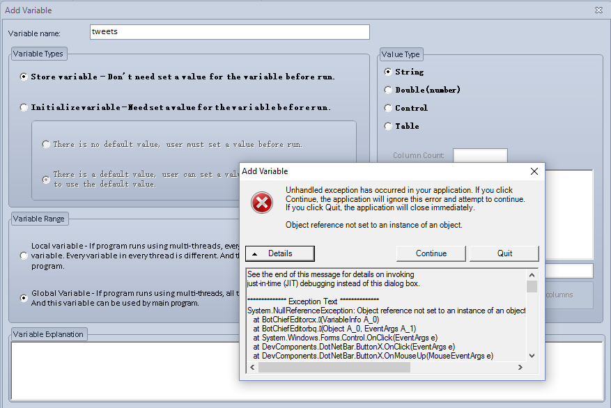 Now I see the variable work but it does not populate the tweet box in twitter with anything. Even with my textbox1 set to the correct variable. Please let me know if it is something I have done improperly or if it is a bug.