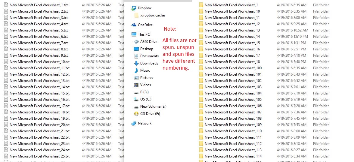 2) The numbering of the unspun and spun files are not same. This creates big problem while comparing the unspun and spun files with each other and their quality of spinning. For example if the unspun file is numbered 100 then the same file after spinning will be given number 1001. Which is a big problem for comparing both of the files with each other.