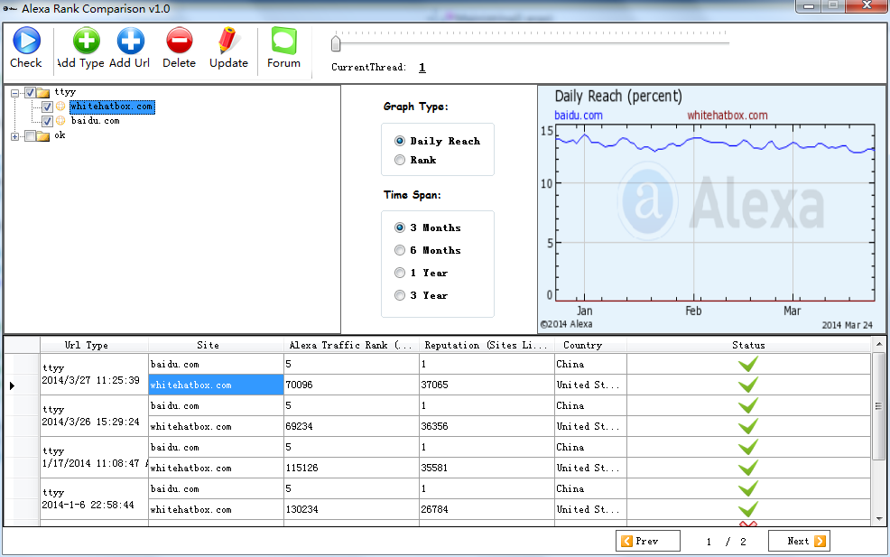 This particular tool allows you to enter up to 5 domains at a time for a side-by-side comparison of Alexa statistics including Daily Reach or Rank, spanning a time period that ranges from 3 months up to 3 years. With just a few clicks of the mouse, you can quickly change those parameters.