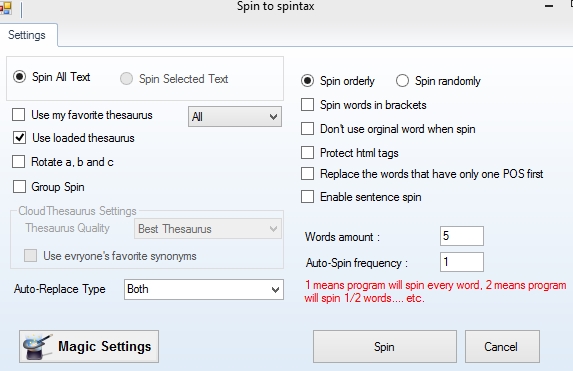 I created a custom thesaurus. I want every single synonym to be spun. Instead, Spin to Spintax only changes a few. Right now, I am having to manually go through my entire documents to select every single synonym. I really, need to automate this. Am I missing a setting somewhere? I feel like I've tried every selection under Spin to Spitax and the Spin button. I set everything to Auto-Spin Frequency to '1', and I still can't get every synonym to spin. I don't need multiple articles, I just need one article spun with the synonyms I added to my custom thesaurus. Even if I manually go through and select all the synonyms, when I go into the 'Spin' button, it won't spin EVERY synonym.