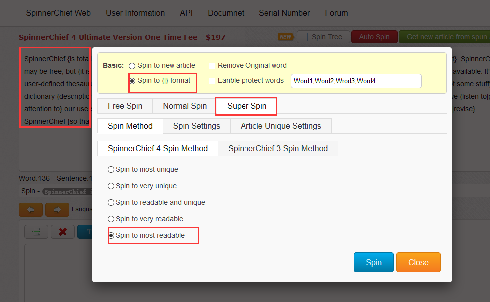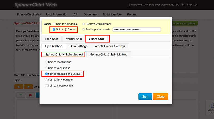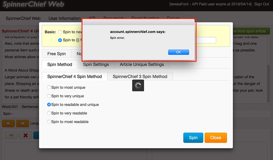 Hi, can you send me your SpinnerChief account and the article you use? I will test it on my side. Many thanks
