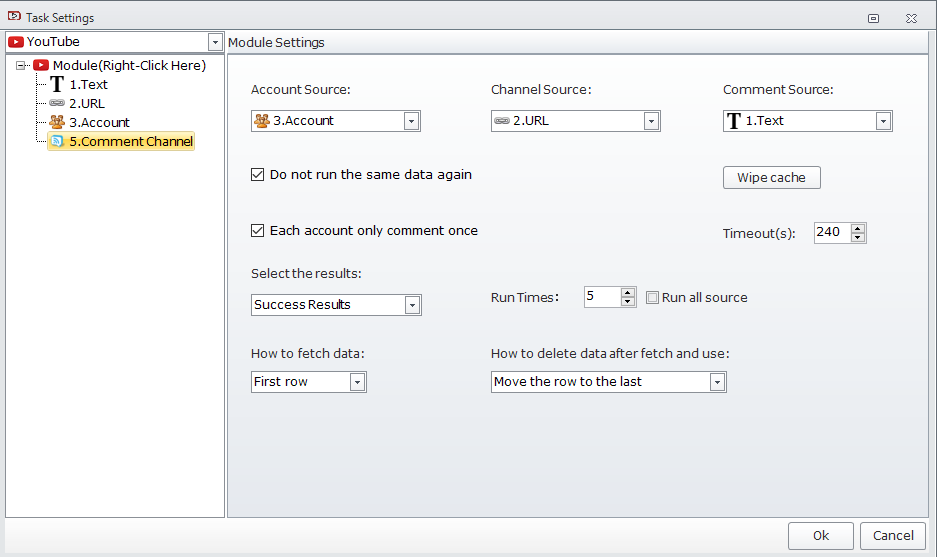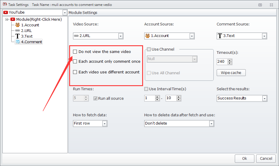 You can see my settings on the image. I just bought the program and having problems to set it up. I succesfully made it work with 1 account with 1 comment on one spesific video. But when I added more accounts and more comments to post on one spesific video. It doesn't work. At first it logs in all of the account one by one. Then wen it comes to commenting it goes into loop. Either it always stays signed in to first account and doesn't do anything or it needs to sign in to the accounts again and cycle never ends. Either way I couldn't make it work multiple accounts to comment on the same video.