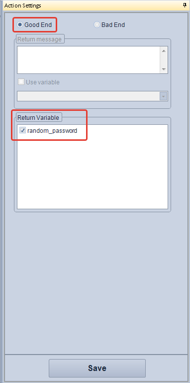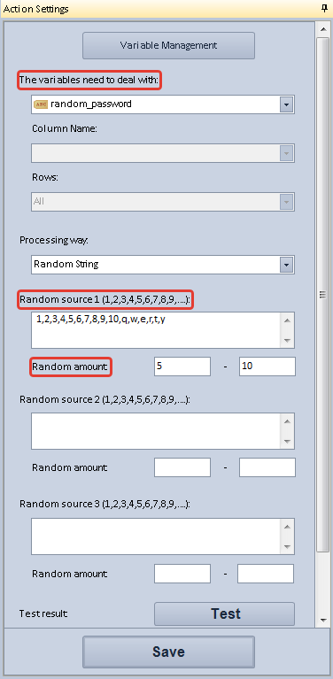 2. Add a Variable Operate action to the module. Select the created variable and specify Processing Way - Random String, the list of characters from which the password should be created and the number of required characters.
