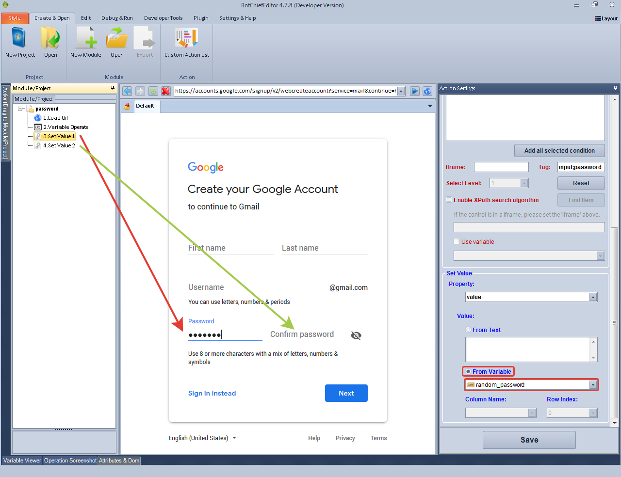 3. Use commands Set Value or Keysrokes Emulation to set a password. In each action, select the necessary elements on the page (the password field is in the first command, the field for repeat password is in the second). And in each command in the Action Settings specify the variable that you used to store the password. In this way, the same password will be entered in both fields.