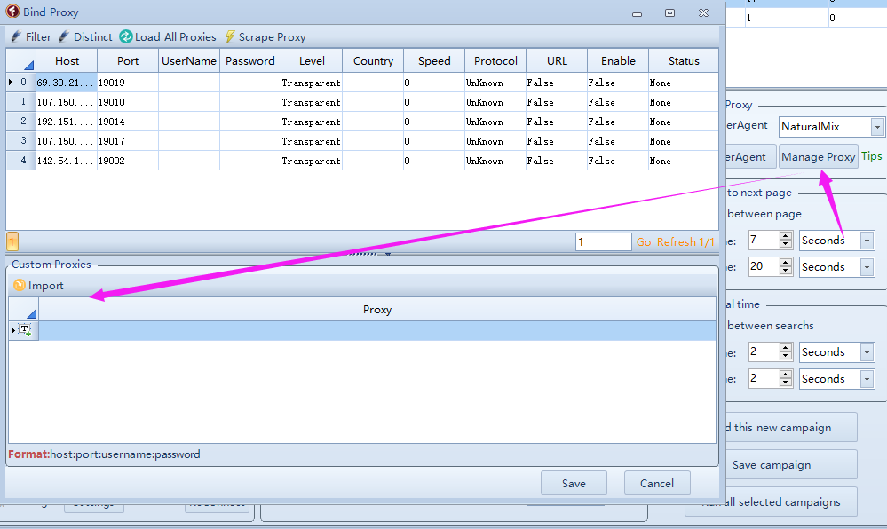 Just click Manage proxy button, then you can upload yourself proxies to use, Or use the Scrape proxy function to scrape proxies from online to use for free.