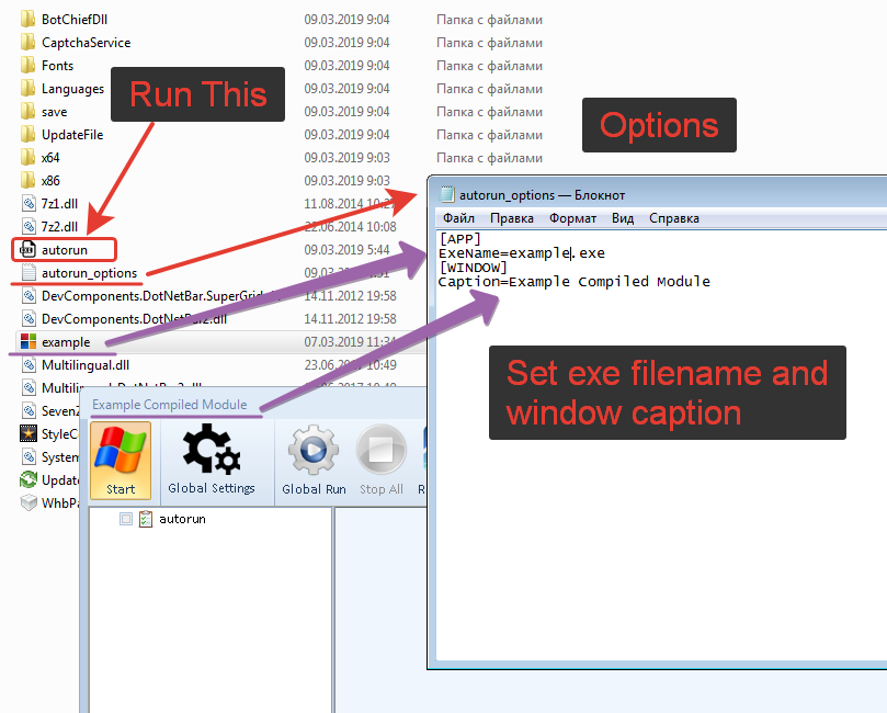 Unzip the archive in the folder with the compiled application that you want to run. At startup, the first module is selected from the list of modules in the compiled application.