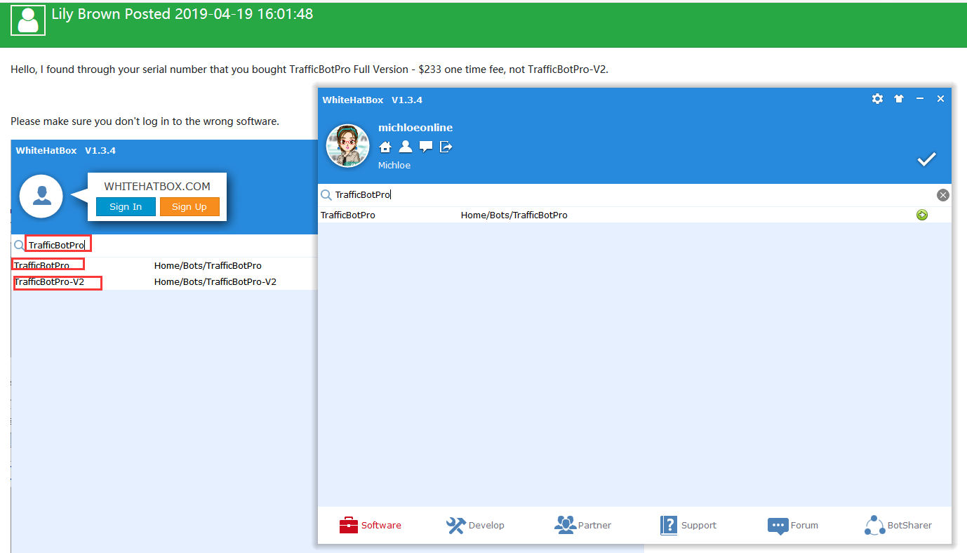 it says my "supporter" is "Lily Brown" but I have not gotten any replies since yesterday morning. When I purchased the program I was under the impression I was purchasing version 2 as I got the 55% discount for Traffic Bot Pro v2. And even on the main website www.trafficbotpro.com it clearly advertises for version 2. Then down at the bottom of the page there is no way to differentiate version 1 from 2 so I naturally assumed purchasing the full version using the version 2 discount code would get me version 2. What I would like is the version 2 that I paid for otherwise if you can't do that I would like a refund please. I also uploaded 4 screenshots in the ticket. As you can see from the screenshots below, the majority of the main page even advertises for version 2. The Traffic Bot Pro Version 2 is the one that I was purchasing, not version 1. So im not sure if it was a mistake on the web page or false advertising. I would simply be happy if I could get the correct version, otherwise please refund me if you won't do that. If someone would please take a look at my ticket I would greatly appreciate it. I have also emailed [email protected] as well as [email protected] about this problem. Waiting for a response, thank you.