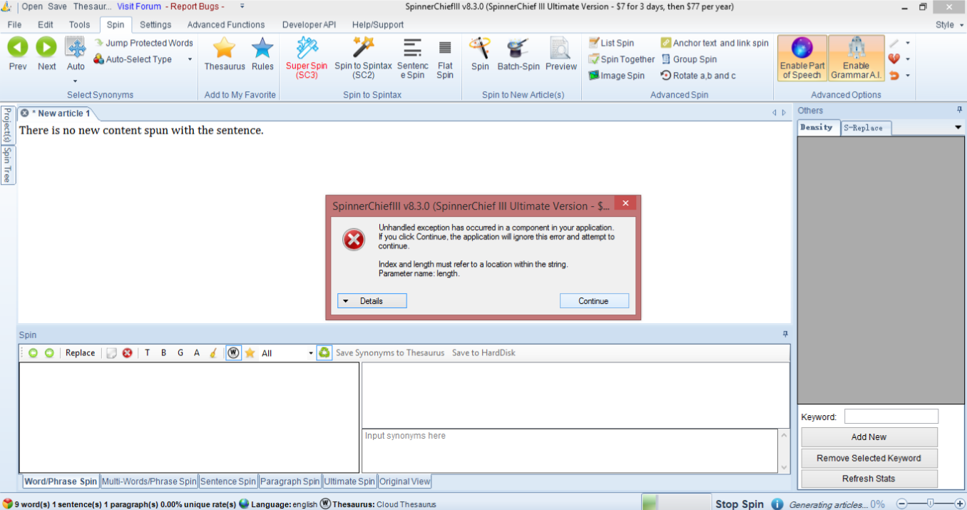 Now,my expectation from purchasing the software last night was that I could generate a spun article that was unique with one click, I did not expect it would be perfect I believed I would have to do some editing.
