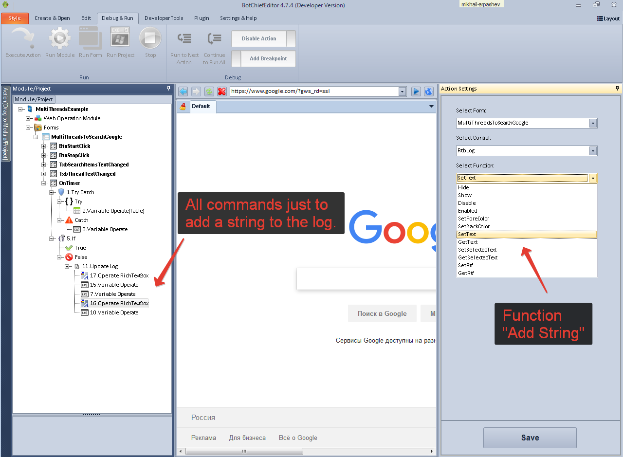 Could you add the ability to add a string to RichTextBox?Now you need to follow these steps:1. Get Text2. Add New Line (\n)3. Add string4. Set TextFirst, it will be easier. Secondly, if the project runs for a long time and the log is large, then the program has to operate with large volumes of lines. (Imagine if the log contains 1000 rows?)...
