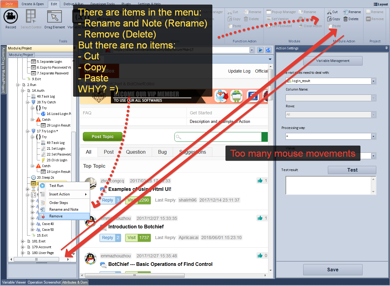 1. Please add items Cut, Copy, Paste to the context menu. They are on the toolbar, but this is very far from the module code and is inconvenient to use....