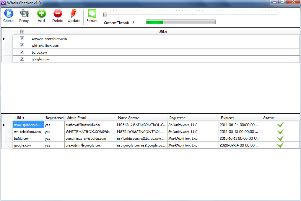 The fastest and simplest way to collect important info, this Whois Checker tool analyzes around 10 domains at the same time. Find out if a domain is registered, gather the email address for domain administrators, find out the domain registrar & name servers, see the expiration time and status… all in just a matter of seconds!...