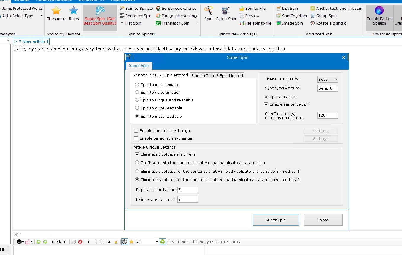 1. What is the function "Spin a, b and c"?2. When auto-matching synonyms, the first word after the symbol | most relevant?3. What does the "Enable sentence spin" function do? Does this feature shuffle sentences within a paragraph?4. And what do the fields in the "Super Spin" mode mean: "Duplicate word amoun" and "Unique word amout". What do they affect?If you can answer the questions with examples.Thank you in advance....