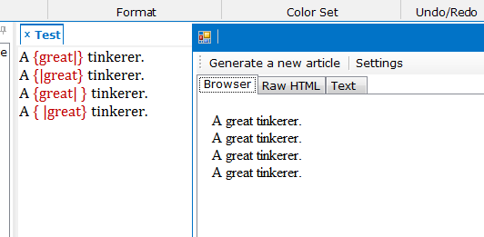 Hi,Blank spin doesn't work. It never chooses the "blank" possibility. I tried several spintax and none worked (either in preview or in spinned files):...